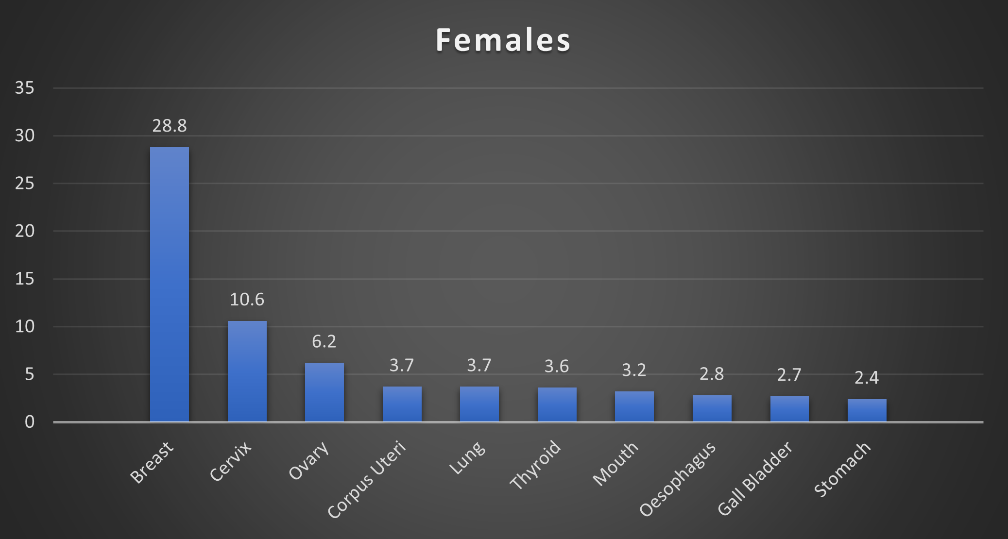 In females, the top 5 leading cancer sites are Breast (28.8%), Cervix (10.6%), Ovary (6.2%), Corpus uteri (3.7%), and Lung (3.7%).