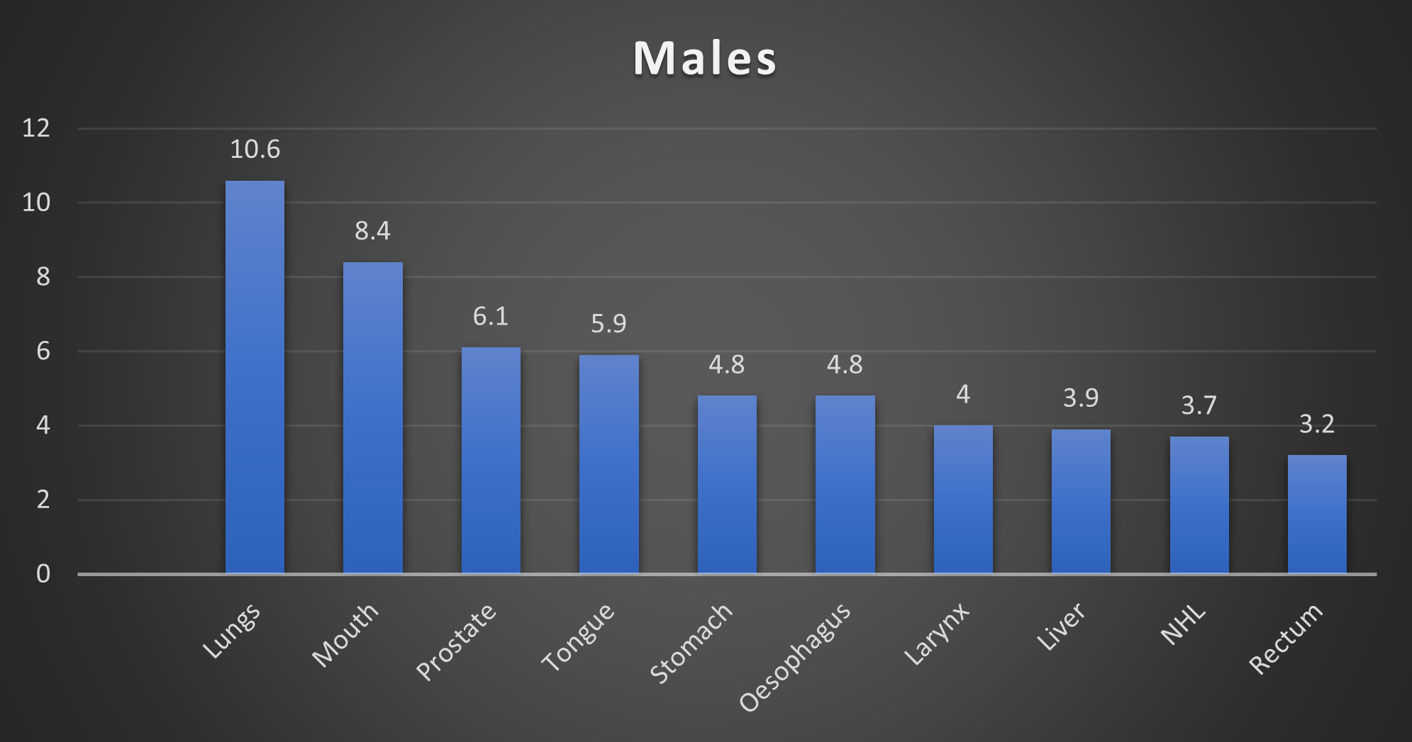 - Lung and breast cancers were the leading sites of cancer in males and females, respectively.