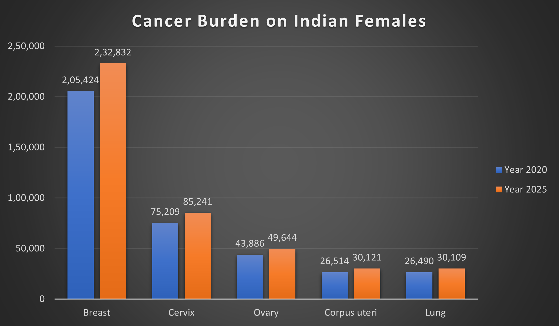 By 2025, these numbers are projected to rise significantly, with Breast cancer cases expected to increase to 232,832, Cervical cancer to 85,241, Ovarian cancer to 49,644, Corpus uteri cancer to 30,121, and lung cancer to 30,109. The total for other cancer sites is projected to reach 378,271, with the overall number of cancer cases anticipated to rise to 806,218.